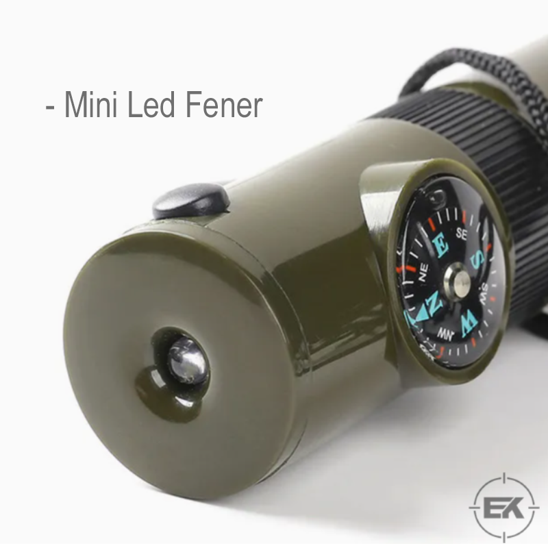 Doğa yürüyüşleri, kamp maceraları ve acil durumlara (deprem, afet) hazırlık için tasarlanmış bu çok fonksiyonlu 7'si 1 arada kampçı düdüğü, ihtiyacınız olan temel hayatta kalma araçlarını tek bir kompakt ve hafif gövdede birleştirir. Sadece bir düdük değil, aynı zamanda eksiksiz bir mini hayatta kalma kitidir.