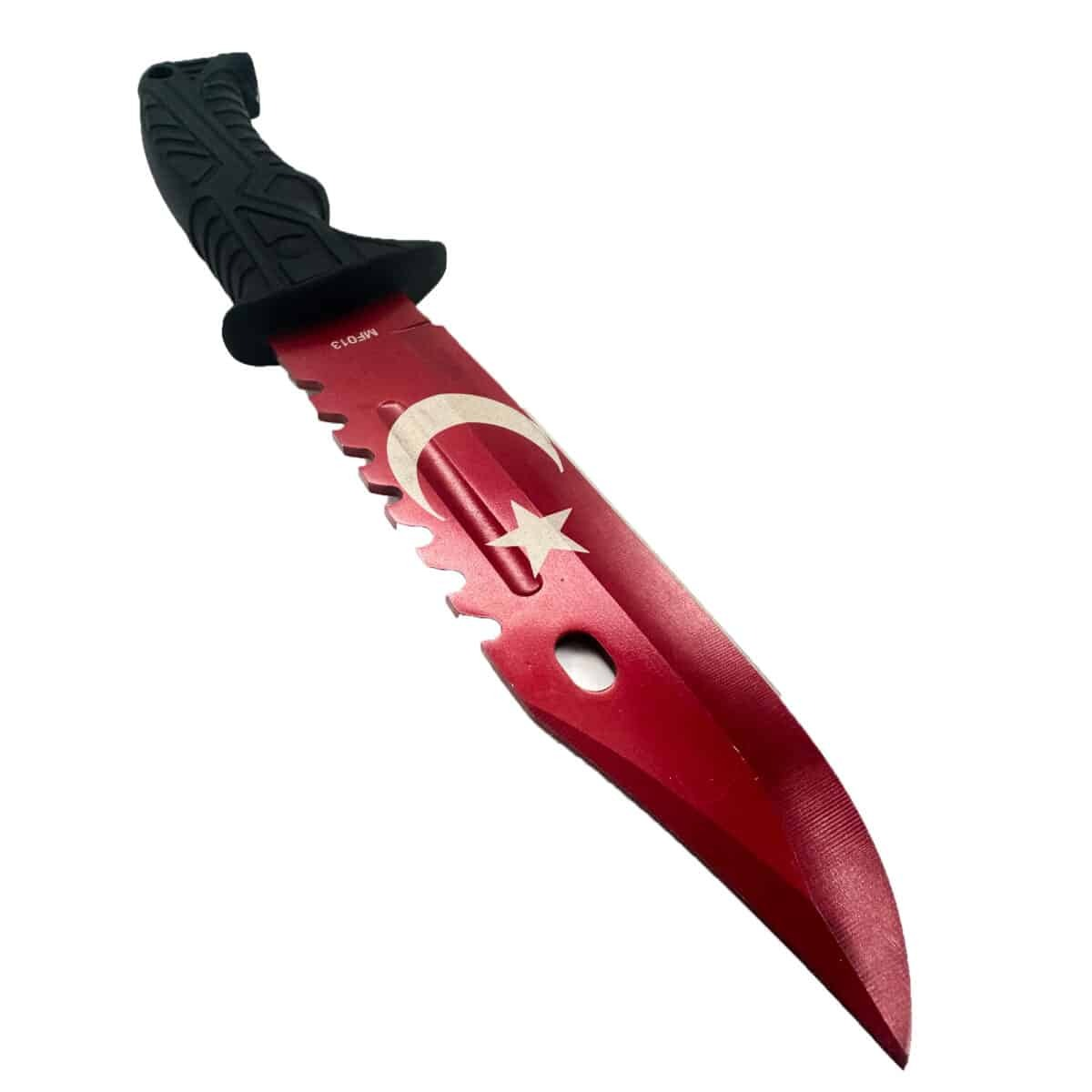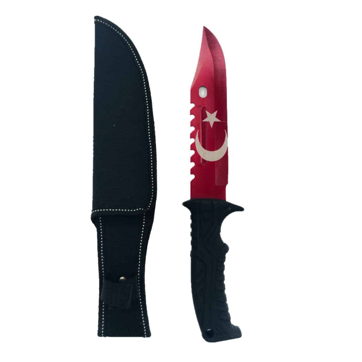 Bıçağın kırmızı renkli gövdesi üzerinde işlenmiş Türk Bayrağı deseni, ürüne estetik ve güçlü bir milli anlam katar. Siyah sapı, ergonomik ve kaymaz yapısı sayesinde elinize tam oturarak güvenli ve rahat bir kullanım sağlar.