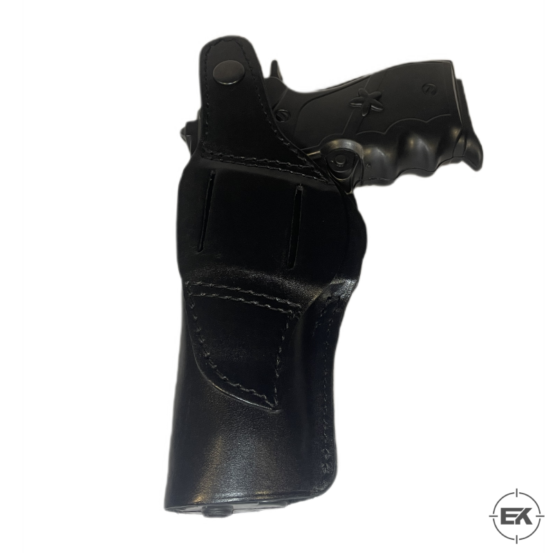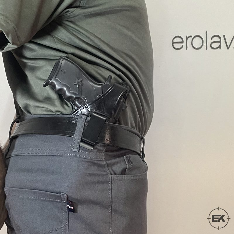 Beretta F92 ve Yavuz 16 gibi tam boyutlu (full-size) ve ağır hizmet tipi tabancalar için özel olarak tasarlanmış bu fonksiyonel silah kılıfı, çok yönlü kullanım imkanı sunar. Bu güçlü platformları taşımanın zorluklarını anlayan bir tasarımla, tek bir kılıfla hem iç taşıma (IWB) hem de dış taşıma (OWB) ihtiyacını karşılar. Siyah deri kılıf, bu ikonik silahların heybetli görünümüyle mükemmel bir uyum sergiler.