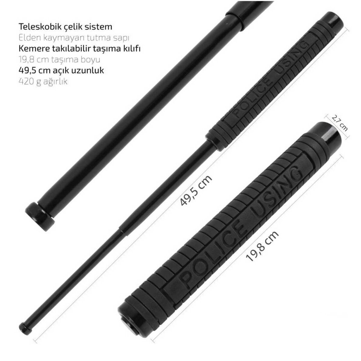 Sağlam Çelik Yapı: Dayanıklı çelik gövde malzemesiyle üretilmiş olup, açıldığında 49,5 cm uzunluğa ulaşarak savunma pozisyonunu güçlendirir.