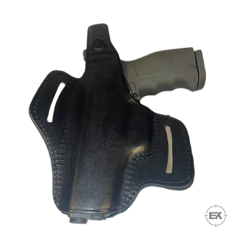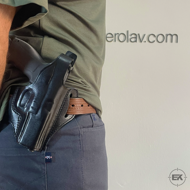 Birinci sınıf hakiki deriden, el işçiliği ile üretilmiştir. Malzeme kalitesi, kılıfın uzun ömürlü olmasını ve zamanla silahın formuna uyum sağlamasını destekler. Çift taraflı kemer geçiş noktaları, silahı vücuda yakın tutarak ağırlığı dengelemek ve sabit bir taşıma sağlamak üzere tasarlanmıştır.